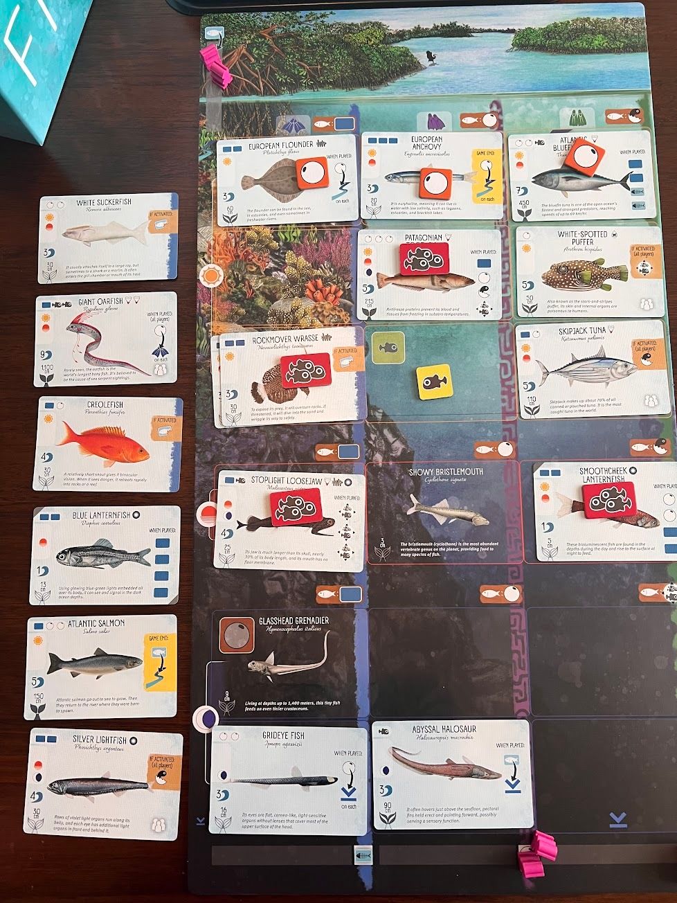 Where the games differ is Finspan’s unique spatial elements. In Wingspan there were 3 environment types to play your birds into. Finspan has 3 columns to place fish into but separates each of those into 3 depths. This makes sense thematically because you wouldn’t find an angler fish or other abyssal fish in the sunlight zones of the ocean.